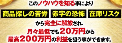 ライバルが侵入できない絶対領域で、続ければ続けるほど楽に稼げる仕組みを伝授。商品探しの苦労・赤字の恐怖・在庫リスクから完全に解放され、月収20万円~200万円は確保可能です。スグに役立つ特典4つ。